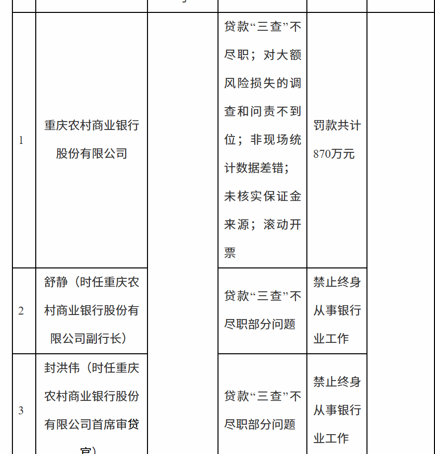 12月25日,国家金融监督管理总局重庆监管局行政处罚信息公开表显示,重庆农村商业银行股份有限公司因贷款“三查”不尽职;对大额风险损失的调查和问责不到位;非现场统计数据差错;未核实保证金来源;滚动开票等被罚款共计870万元。舒某、封某伟被禁止终身从事银行业工作;彭某、曾某逊、张某义、郑某、沈某被警告并罚款5万元;李某、黄某翔、崔某被警告。