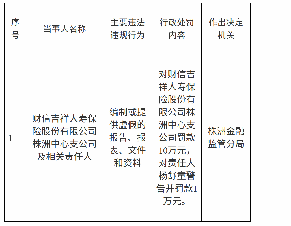 12月26日,国家金融监督管理总局株洲监管分局行政处罚信息公示列表显示,财信吉祥人寿保险股份有限公司株洲中心支公司及相关责任人因编制或提供虚假的报告、报表、文件和资料被罚款10万元,责任人杨某童被警告并罚款1万元。