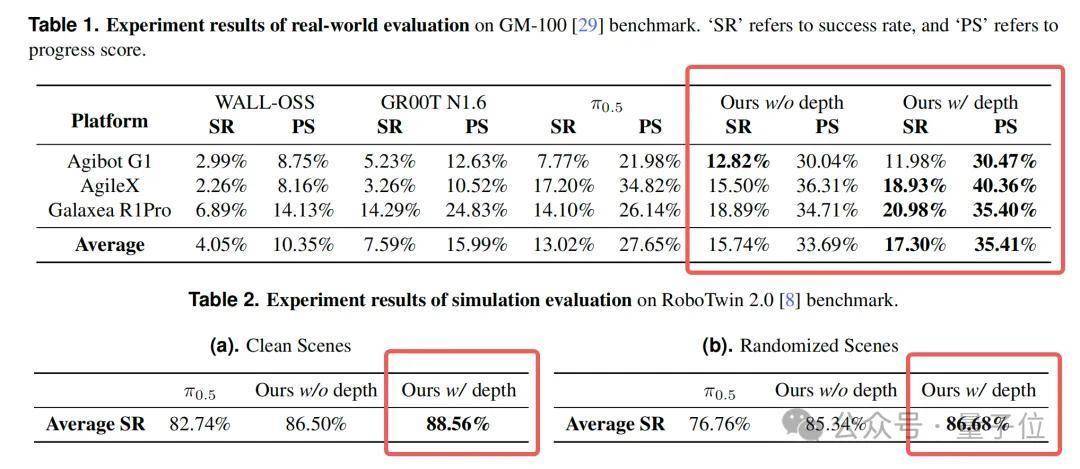 而融合了深度信息的LingBot-VLA,则在三项指标上均显著超越了目前公认的强基准——π0.5。